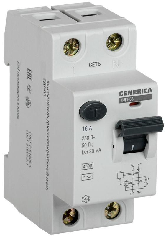 Быстродействующий защитный выключатель ВД1-63 (УЗО) GENERICA - устройство электронного типа, зависящее от напряжения и реагирующее на дифференциальный ток, без встроенной защиты от сверхтоков. Предназначен для защиты человека от поражения электрическим током.